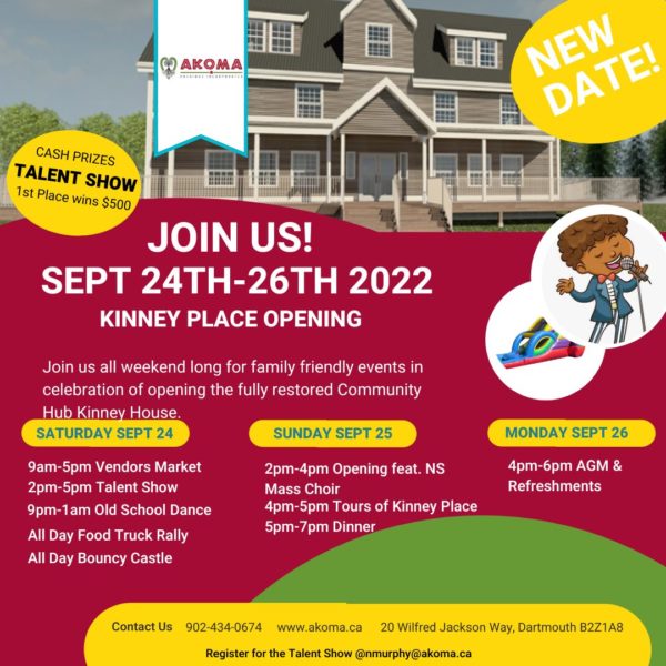 Kinney Place Grand Opening will take place September 24-26 and will be a weekend-long celebration with bouncy castles, old school dance, talent shows, black vendors and more. Kinney Place Grand Opening Date: September 24-25, 2022 Time: All day Location: 20 Jackson Way Phone: 902-434-0674 Website: www.akoma.ca Facebook: https://fb.me/e/485sRp3uA