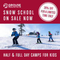 With classes at Grouse Mountain, you can be sure your kids will spend their days building their skills and taking in that fresh mountain air, with the only “I’m bored” you hear about being the “board” they are learning on! Not only does Grouse Mountain offer the best value for lessons on the North Shore, but they also offer classes for ages 3-18, plus adult lessons as well! For more details, click here.